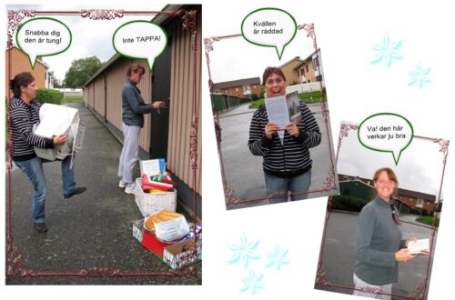 – Jag hittade dem nedanför backen! De bara stod där liksom! Jag tror att jag skall gå in en stund! Det är en vithårig gubbe som rusar runt nedanför backen. Konstigt!Härligt!