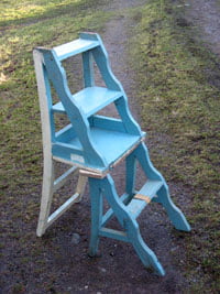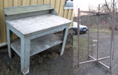 Jag hittade en stol därinne som jag har trott varit en barnstol, men när man fäller ut den så blir det en trappa. Den är ju jätte praktisk! Och kan bli riktigt fin att ha blommor på vid växthuset eller på uteplatsen. Planteringsbordet kan jag antingen kakla eller sätta en plexiskiva på så att det håller för att söla med jord på. Den konstiga grejen vid höger om planteringsbordet tror jag är till vävstol eller dylikt. Vet inte riktigt vad jag skall göra med den? Den var ganska angripen av mask så jag kanske kan hitta på någonting i trädgården med den. Vill inte ta in den när den är så pulvrigt. Min syster är bra på hur jag kan bevara den och att få den ren från mask.