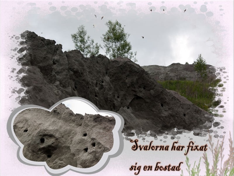 När vi var på väg till andra sidan av denna gigantiska grop. Micael ville visa verkstaden där han mest höll till så gick vi förbi olika sand schakt. Här hade svalorna byggt bo och flög irriterat runt när vi närmade oss. Gubben undrade om det var här man fick ” fågel på köpet” när man köpte sand. Vi har funderat på att ta åkgräsklipparen med flak och hämta ett par lass grus. Micael passade på att visa gubben hur han skulle köra för att hämta de olika sandsorterna. Nu fick vi se att de även hade bark för trädgården.