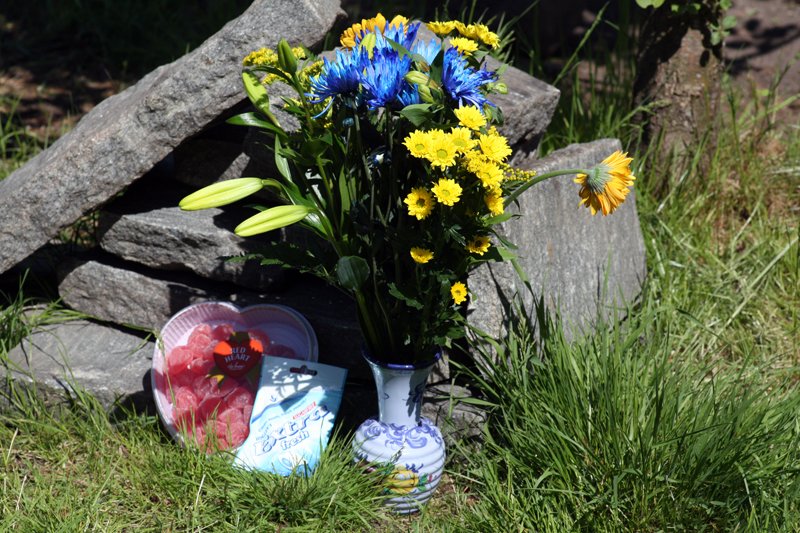 Till slut dök han upp igen – triumferande – med en gammal brandsläckare i famnen som han absolut ville prova. Jag plockade fram några blommor som han kunde “vattna”, och Lill-polarn pumpade för fullt. Brandsläckaren fungerade alldeles utmärkt – lite för bra till och med – och strax var både blommor, väggar och halva gården genomdränkta.